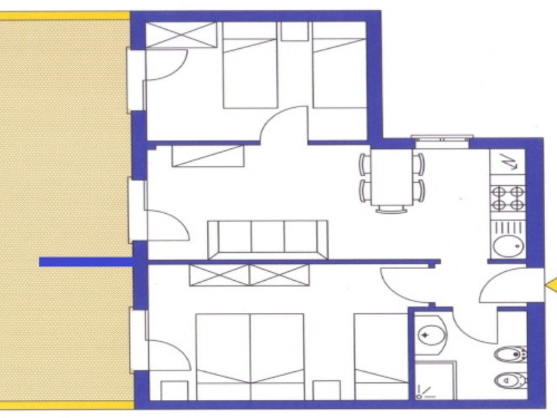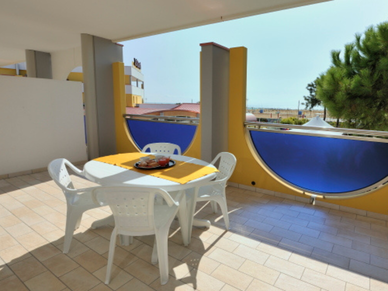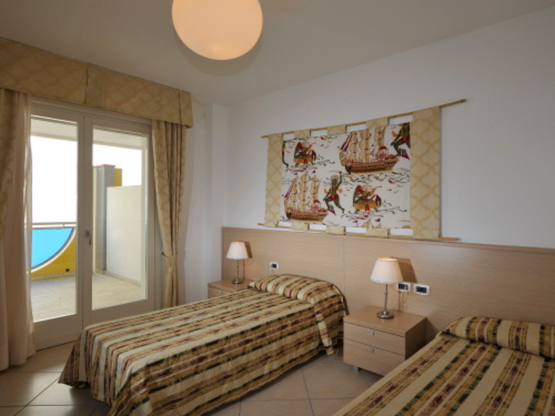 Dreizimmerwohnung für bis zu maximal 6 Personen bestehend aus Wohnzimmer mit Kochnische und Einzelschlafsofa, Schlafzimmer mit Doppelbett und Einzelbett, Schlafzimmer mit 2 Einzelbetten, Bad, große Terrasse auf der Südseite mit Meerblick.