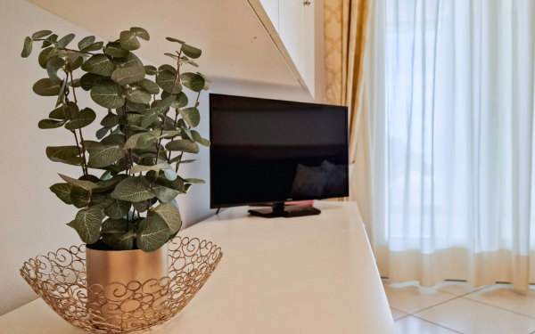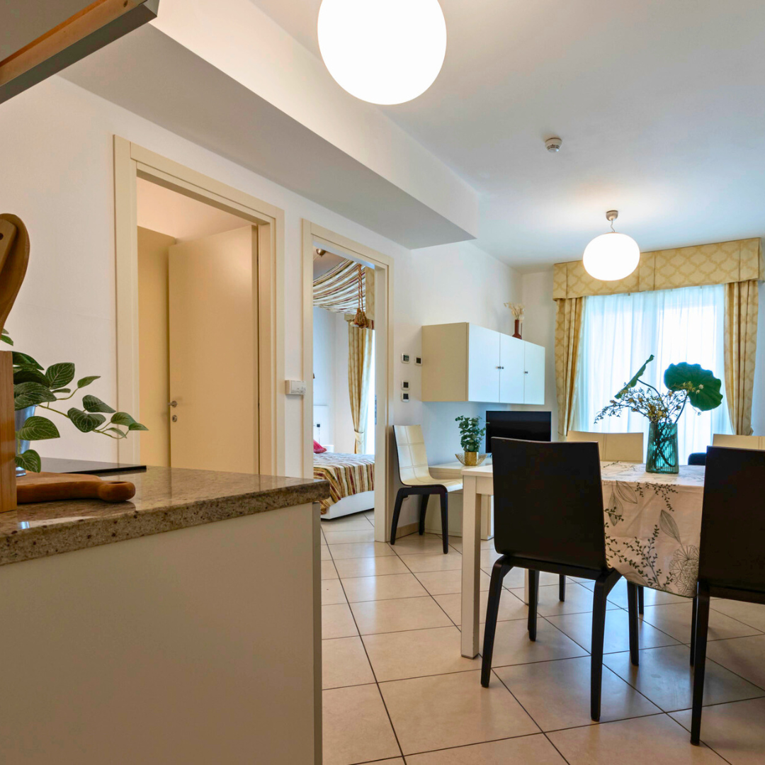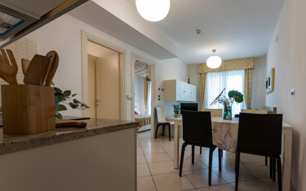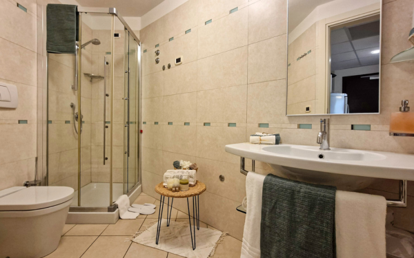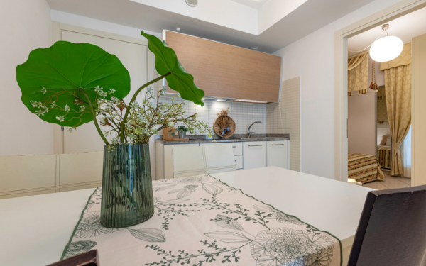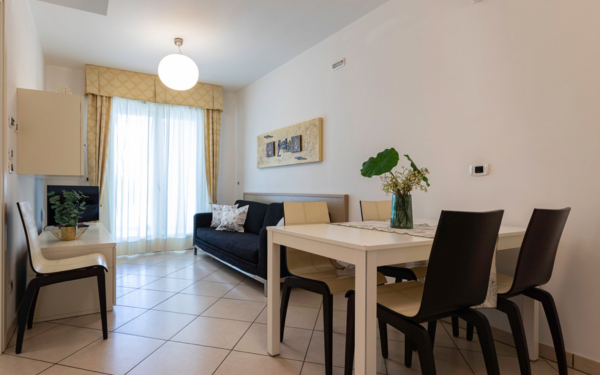 With an interior area of about 55 m², these elegant three-room penthouse apartments can comfortably accommodate up to 5-6 people. They have a spacious living room with kitchenette and sofa bed, two double bedrooms (one with a possible third bed), and two modern bathrooms with double showers to ensure maximum privacy and comfort.